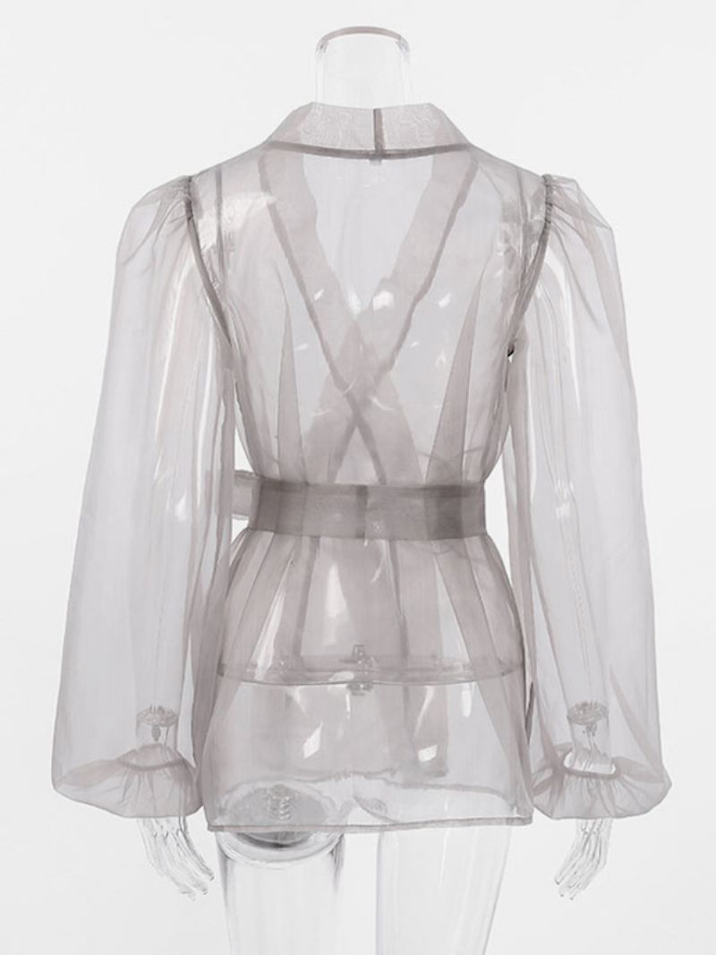 Camisa Feminina Cinza Elástica Plissada Com Renda E Decote Em V Casual Manga Comprida Tops Tule