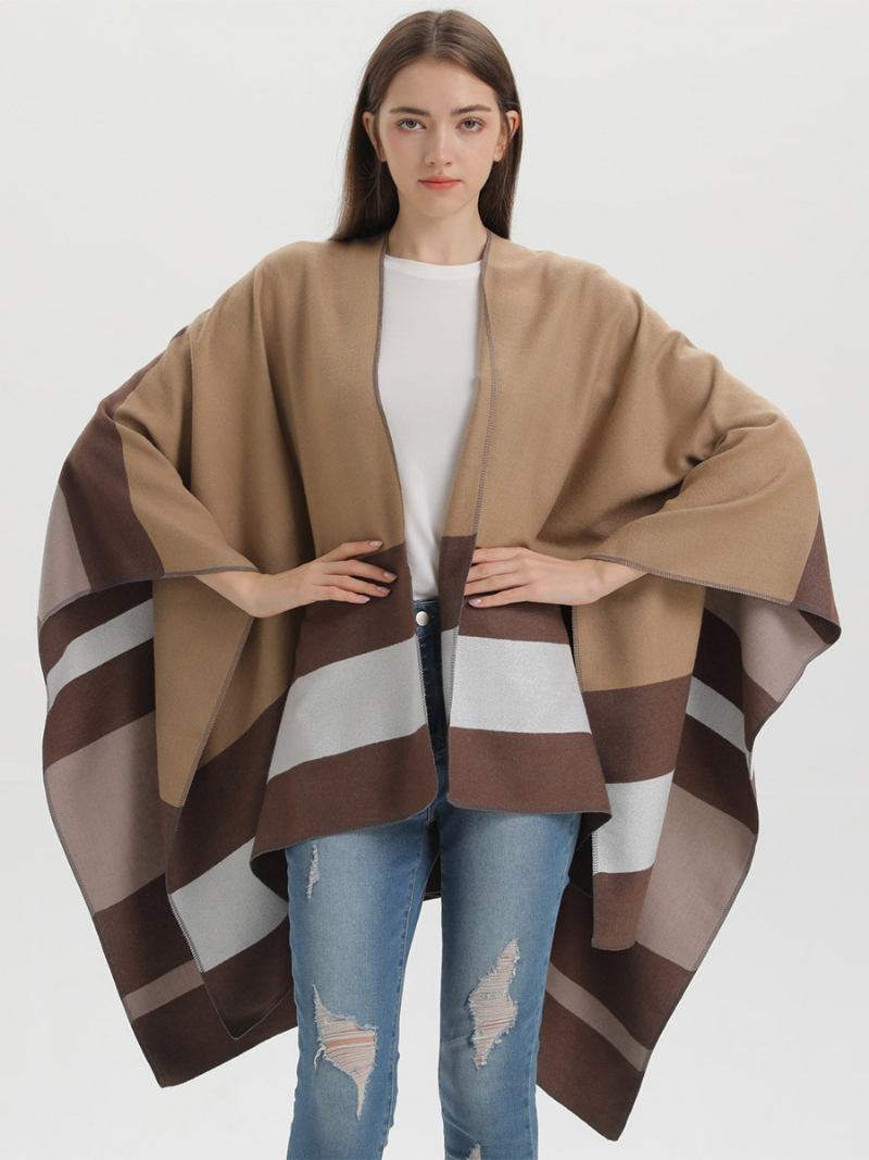 Capa Feminina Oversized Listrada Colorida Bloco Outono Inverno Poncho