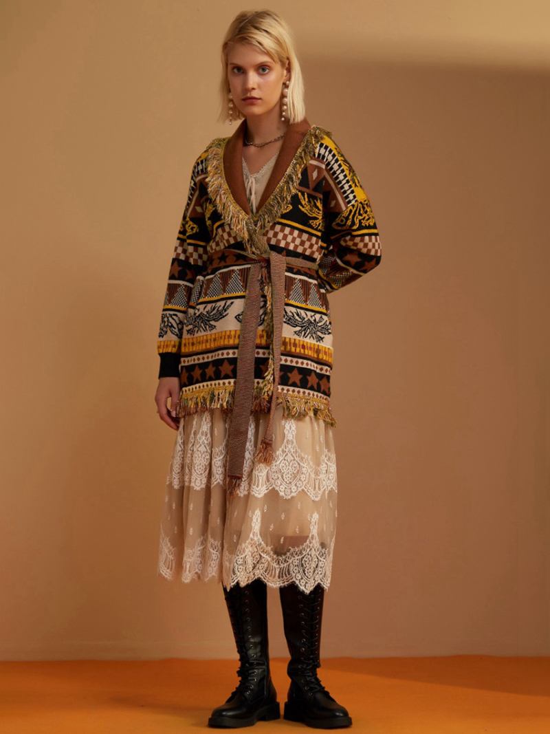 Cardigã Feminino Jacquard Marrom Café Com Borla E Cinto Mistura Lã Boho Suéter