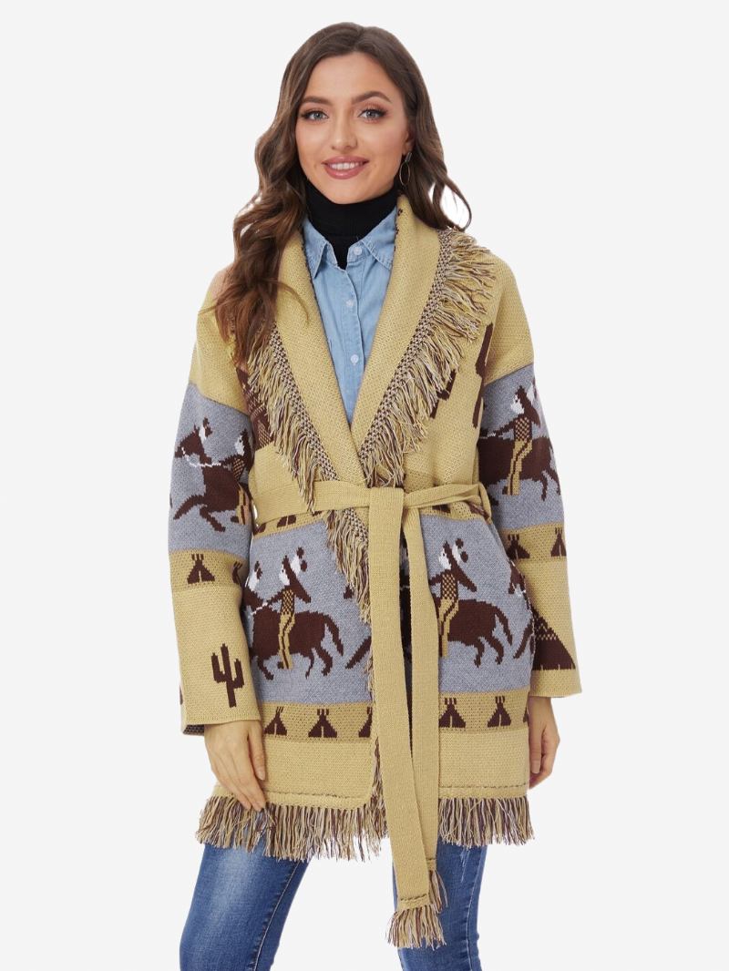 Cardigans Jacquard Femininos Com Borla E Cinto Mistura Lã Suéter Inspirado Boêmio