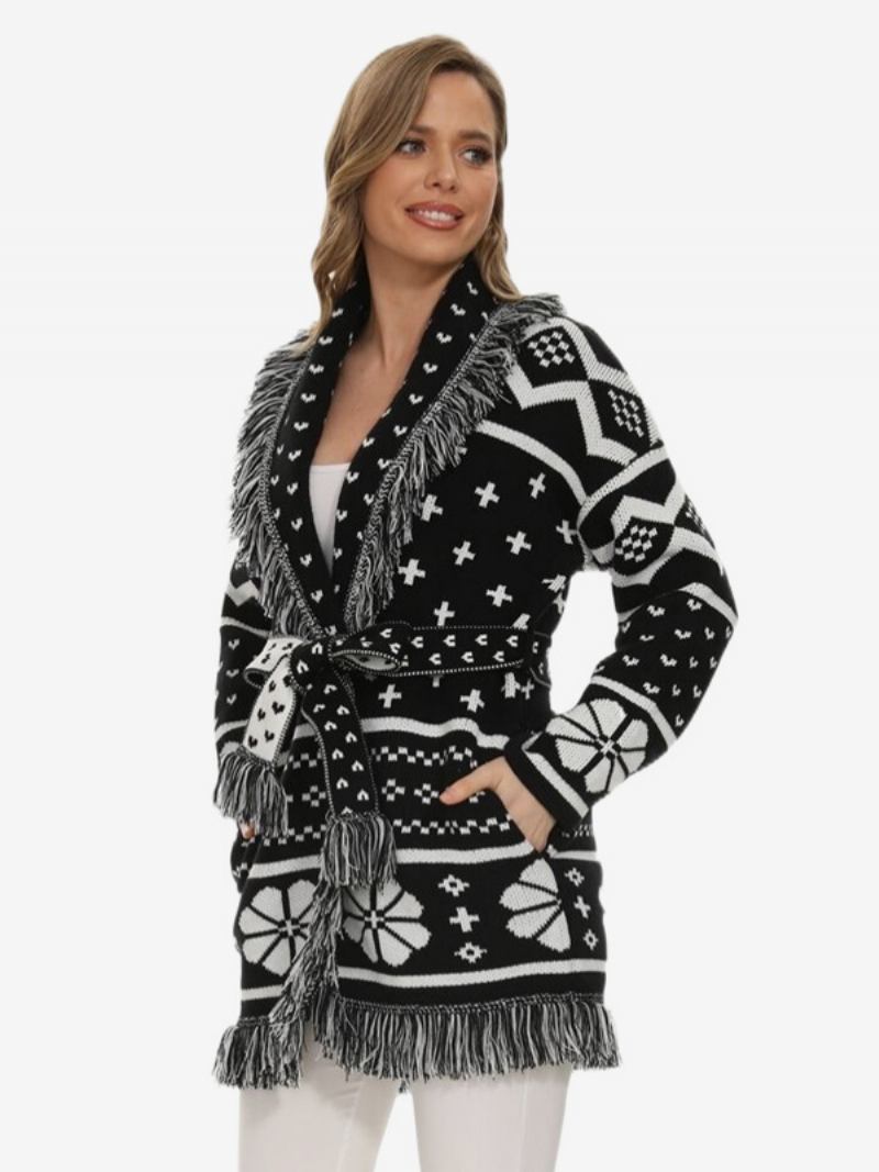 Cardigãs Femininos Com Frente Aberta E Borla Cinto Ombros Caídos Suéter Mistura Lã
