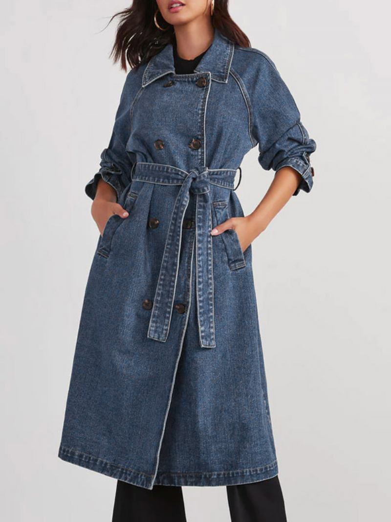 Casaco Jeans Longline Com Peito Duplo E Cinto Feminino