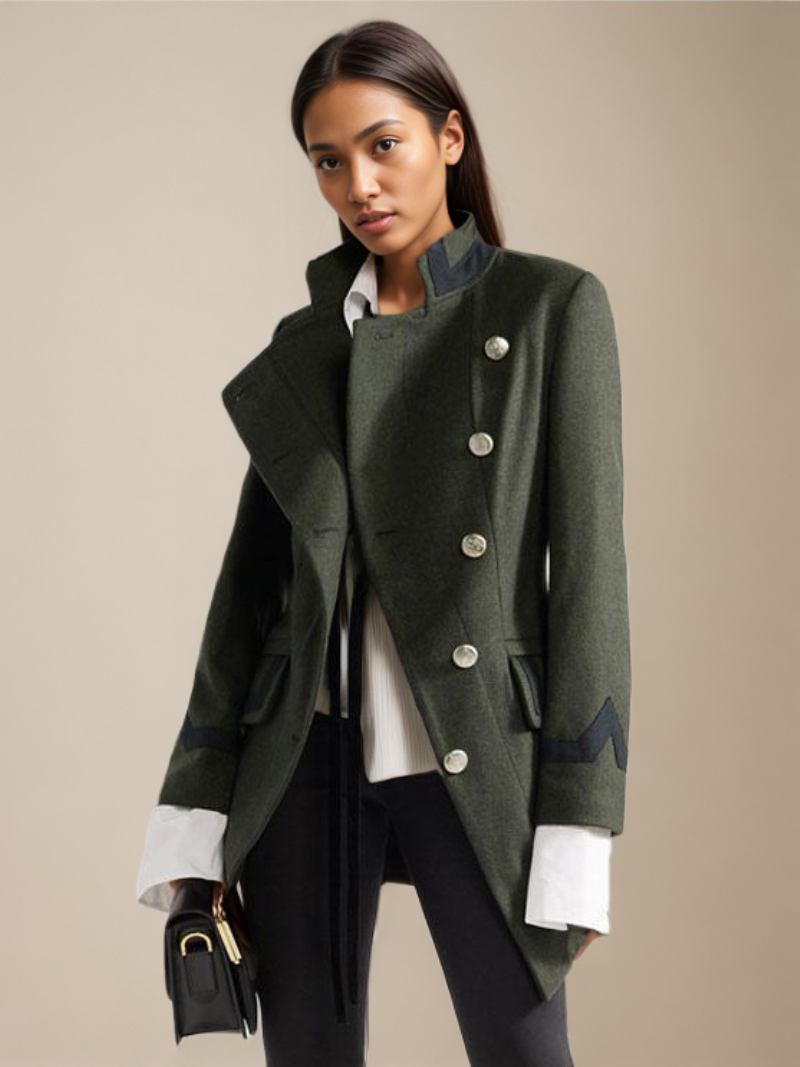 Casaco Lã Militar Feminino Assimétrico Botões Bolsos Caçador Verde Manga Longa Inverno Aconchegante Ativo Outerwear