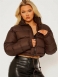 Casacos Puffer Femininos Marrom Profundo Gola Com Zíper Mangas Compridas Cordão