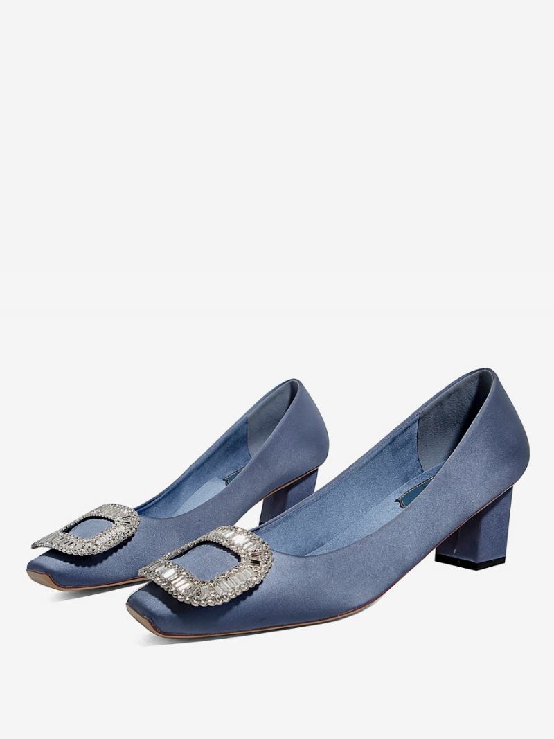Feminino Salto Médio Baixo Cetim Preto Strass Bico Quadrado Grosso Bombas Festa