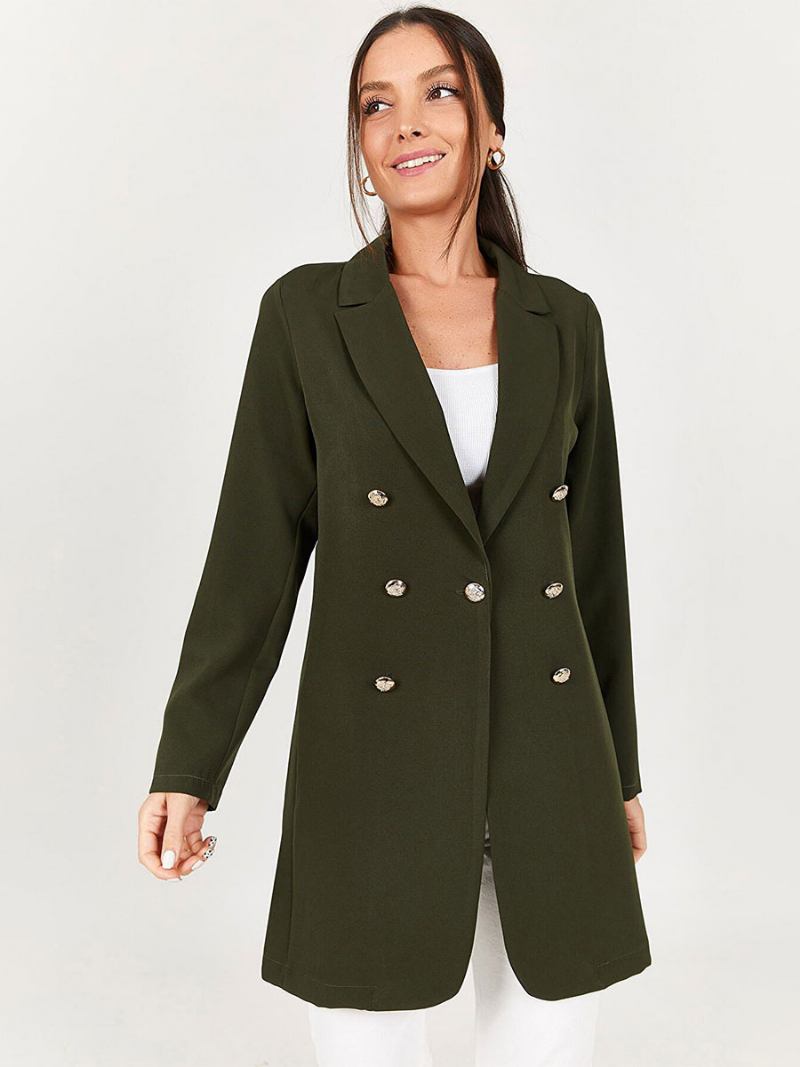 Jaqueta Blazer Longa Para Mulheres Preto Cor Sólida Casual Duplo Breasted Primavera Outono Outerwear Relaxado