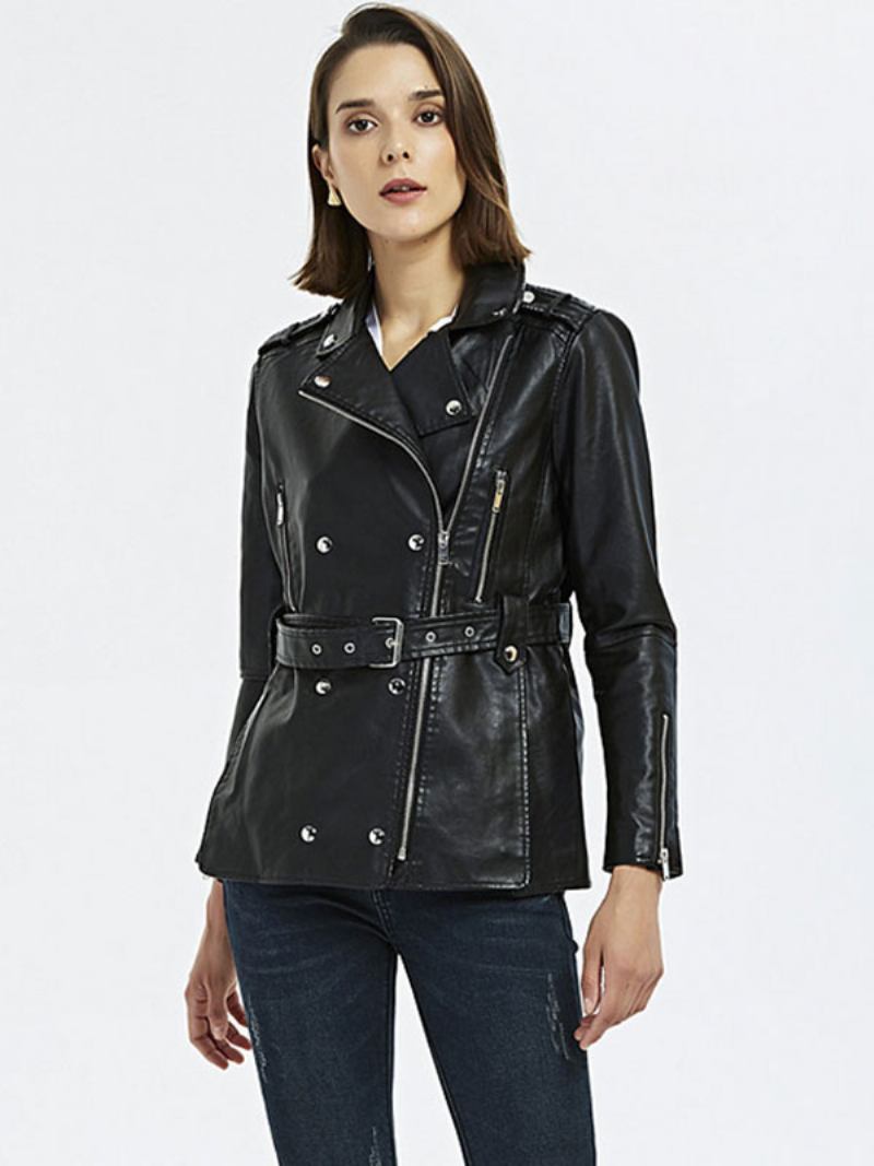Jaqueta Couro Falso Para Moto Preto Pu Zíper Gola Aberta Manga Comprida Estilo Namorado Primavera Outono Roupa Motociclista Mulheres