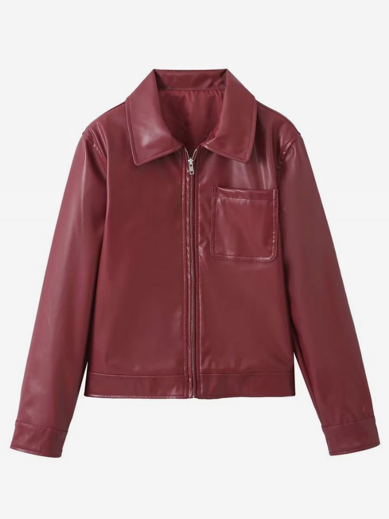 Jaqueta Couro Pu Com Gola Aberta E Mangas Compridas Zíper Feminino Streetwear