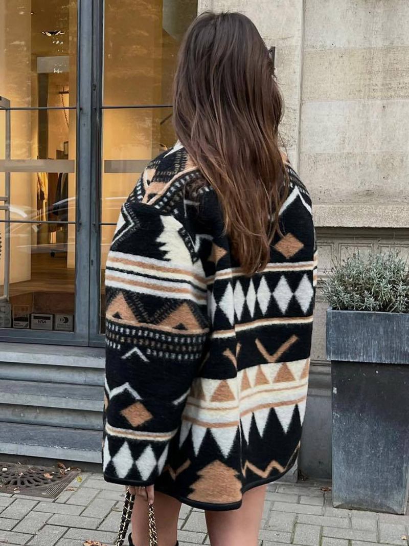 Jaqueta Estampada Asteca Grande Ombro Caído Botões Frontais Agasalhos Femininos