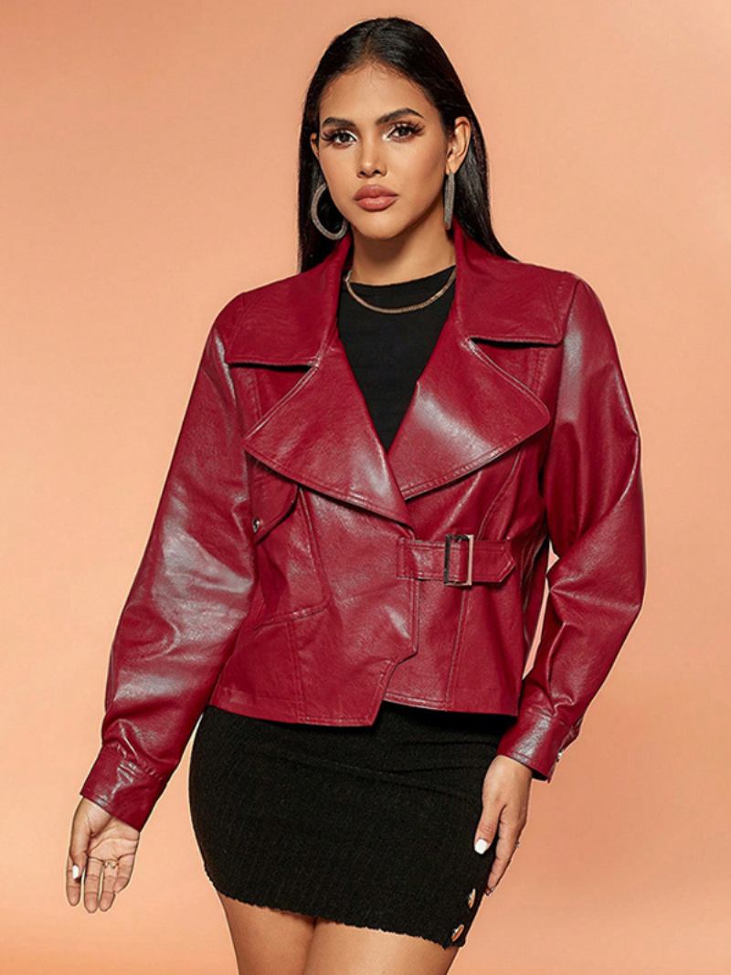 Jaqueta Feminina Couro Pu Com Lapela Entalhada E Detalhes Metal