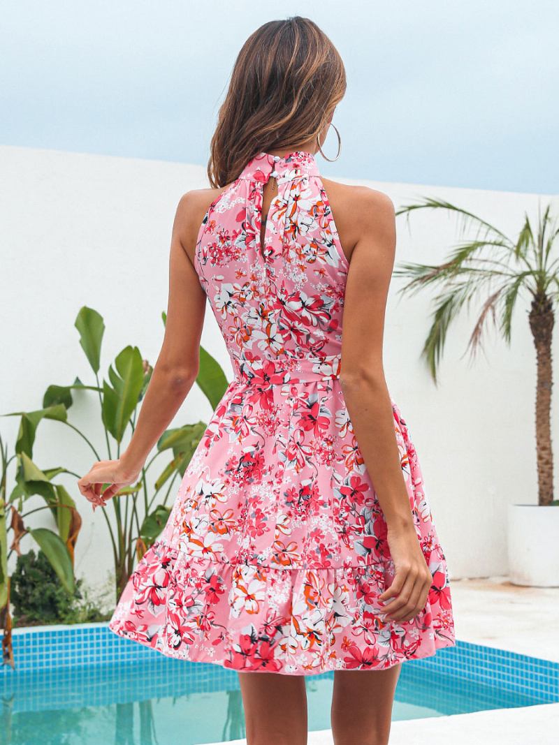 Minivestidos Femininos Rosa Floral Estampado Vestido Curto Sem Mangas
