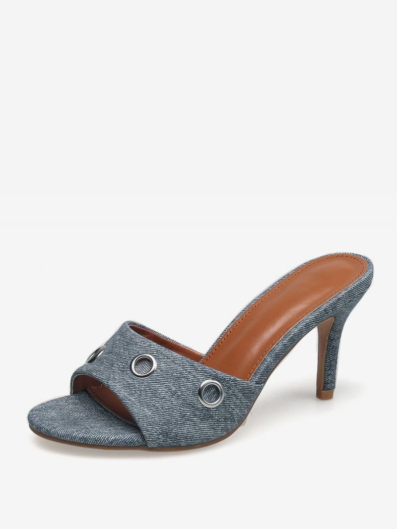Mules Femininos Com Salto Agulha E Lona Azul Celeste