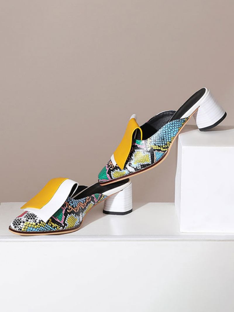 Mules Femininos Salto Alto Pele Cobra Com Bloco Slip-on