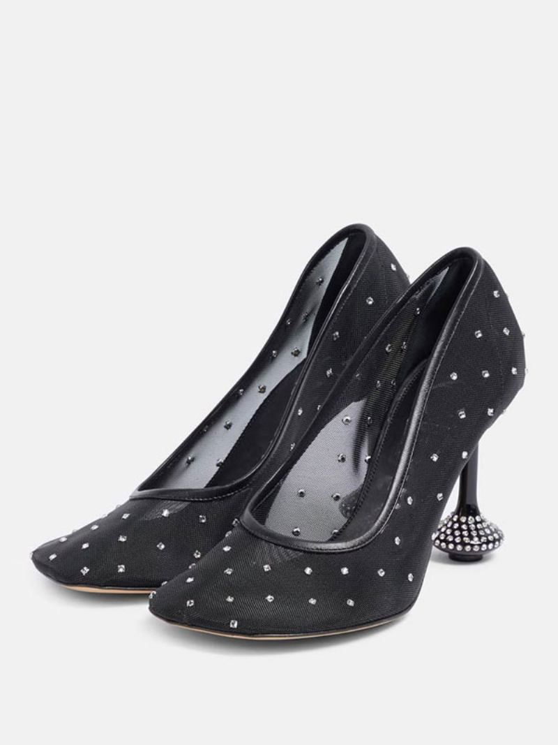 Mulher Malha Preta Salto Alto Suqare Toe Strass Bombas Em Formato Especial