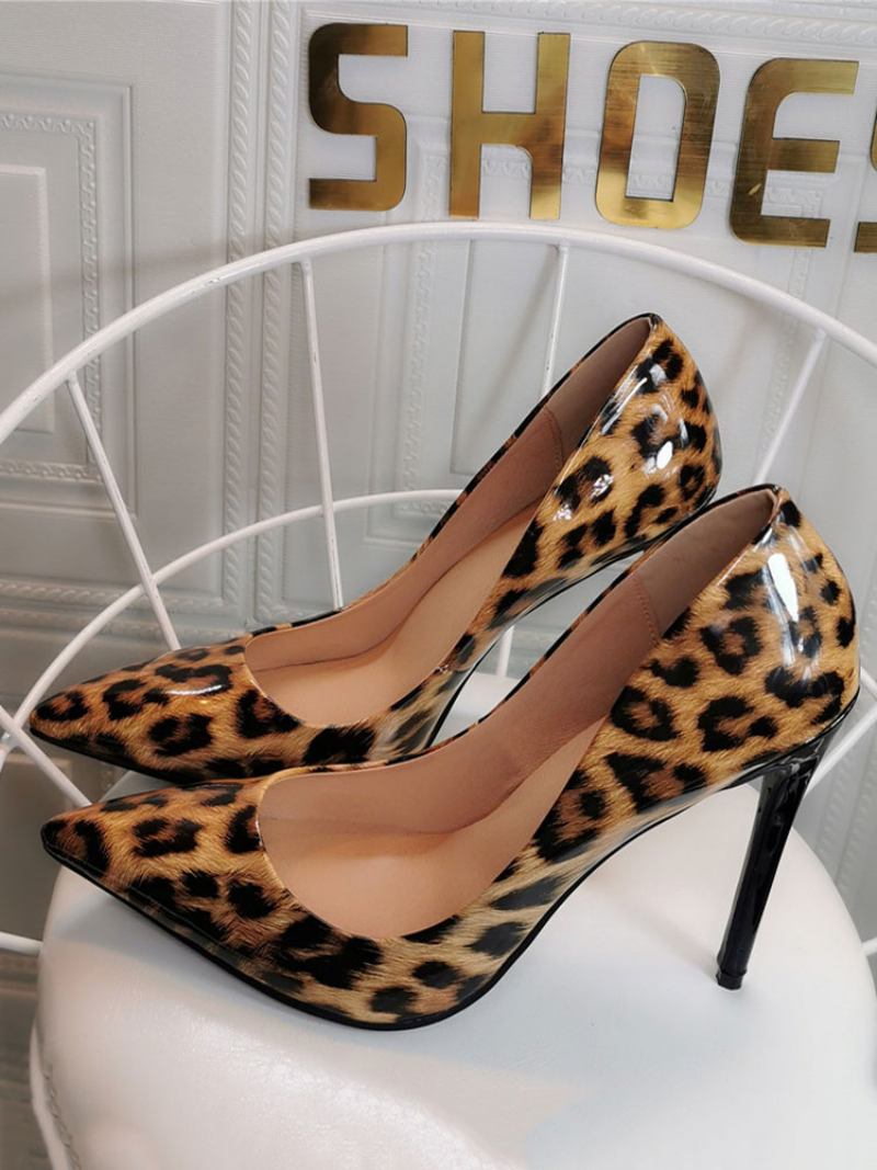 Mulheres Café Marrom Bombas Salto Agulha Dedo Do Pé Pontiagudo Leopardo Impresso Patente Pu Casual Saltos Sexy