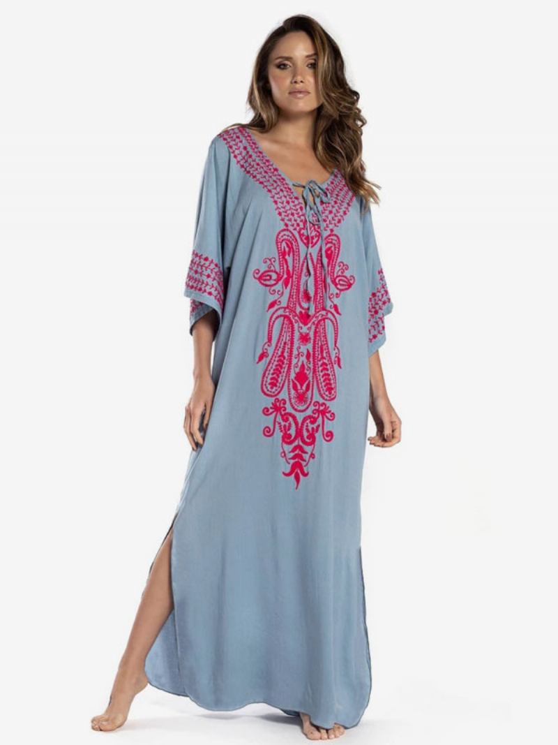 Mulheres Cover Ups Dark Navy Color Block Bordado Com Decote Em V Mangas 3/4 Comprimento Oversized Verão Sexy Swimwear