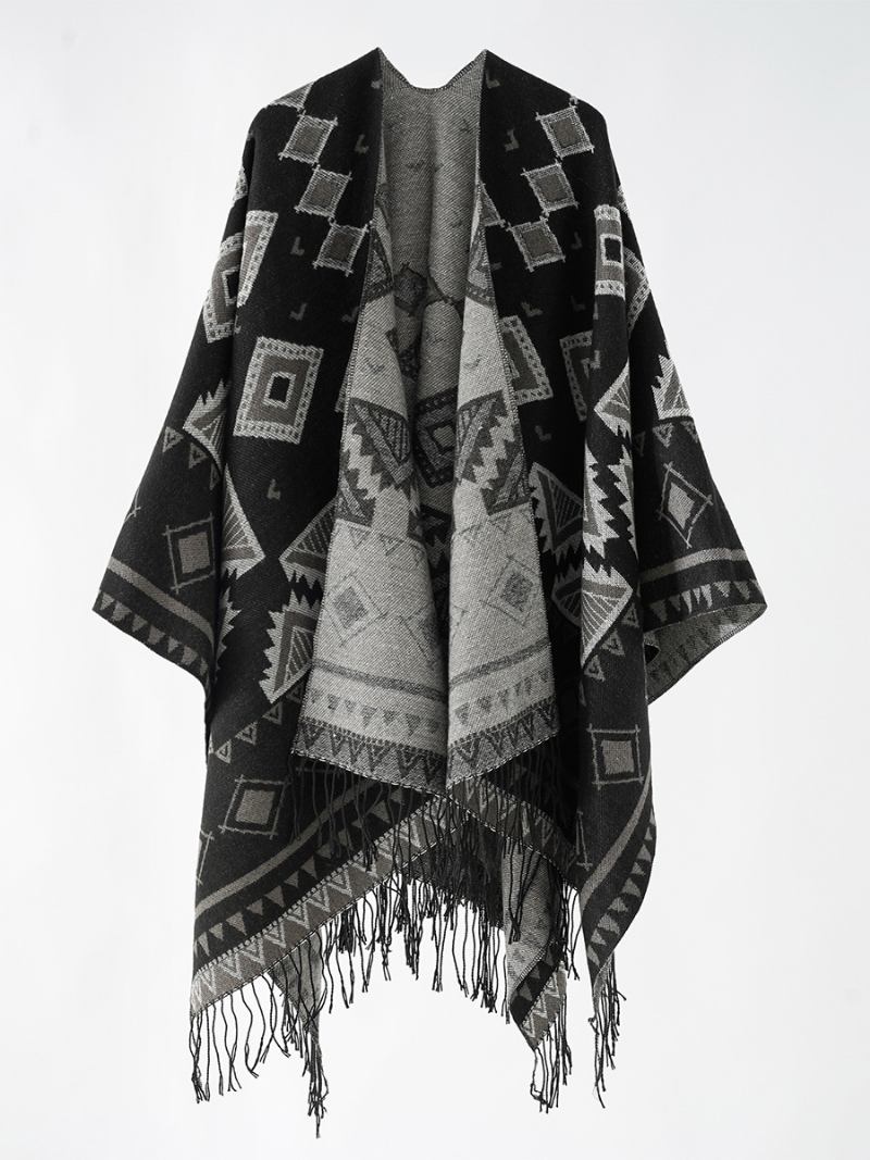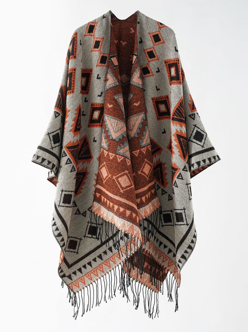 Poncho Feminino Com Estampa Geométrica Capa Casual Diária Franja