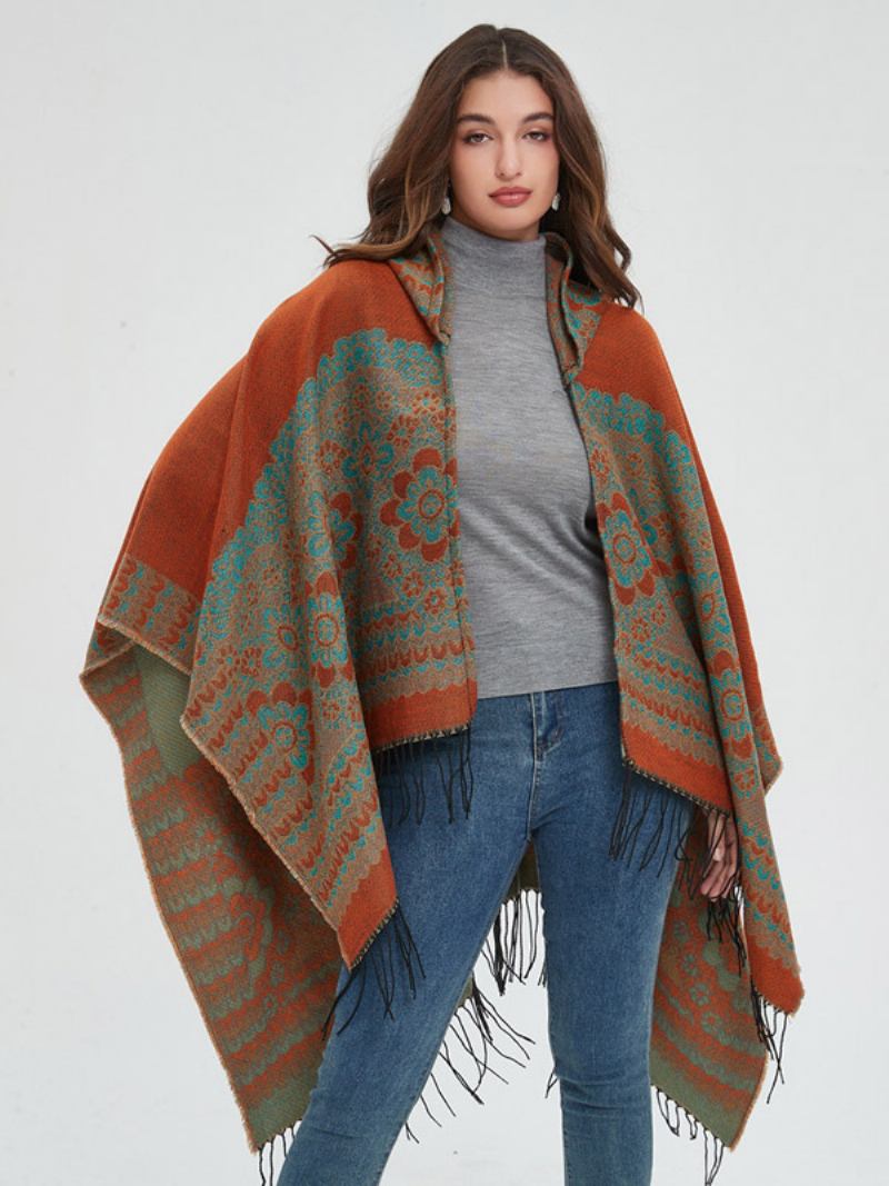 Poncho Floral Embelezado Com Capuz E Franja Capa Feminina Grande