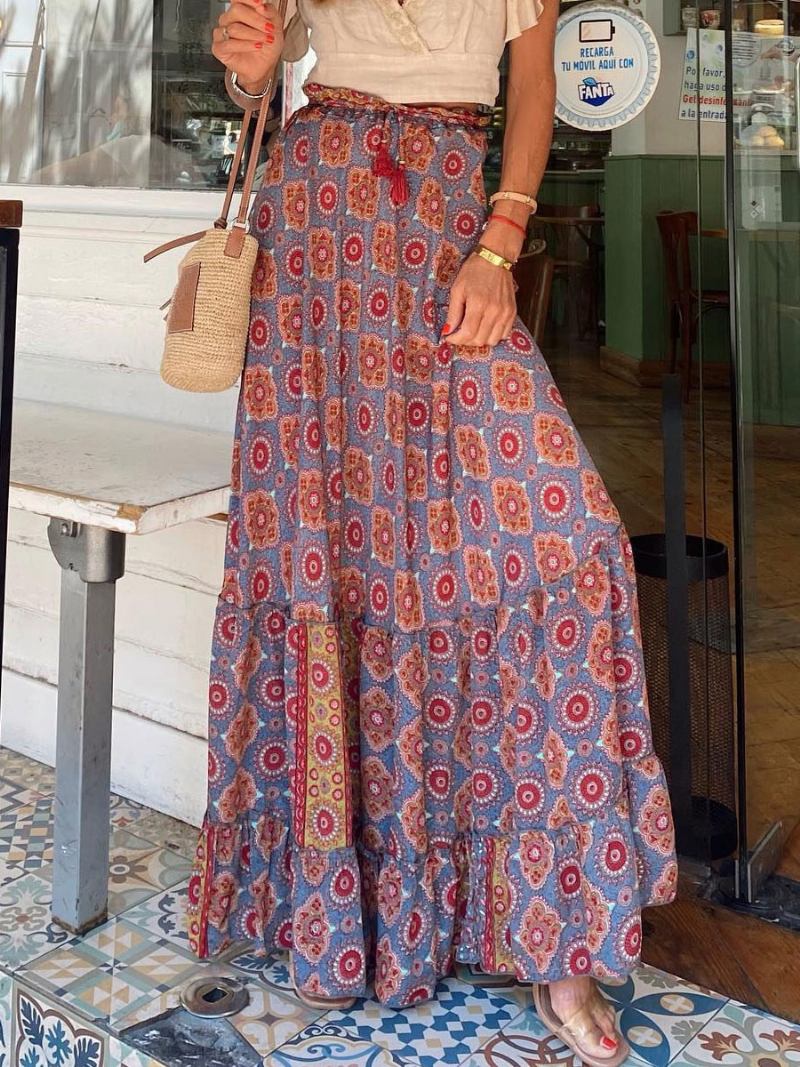 Saia Feminina Azul Babados Estampa Floral Cintura Alta Longa