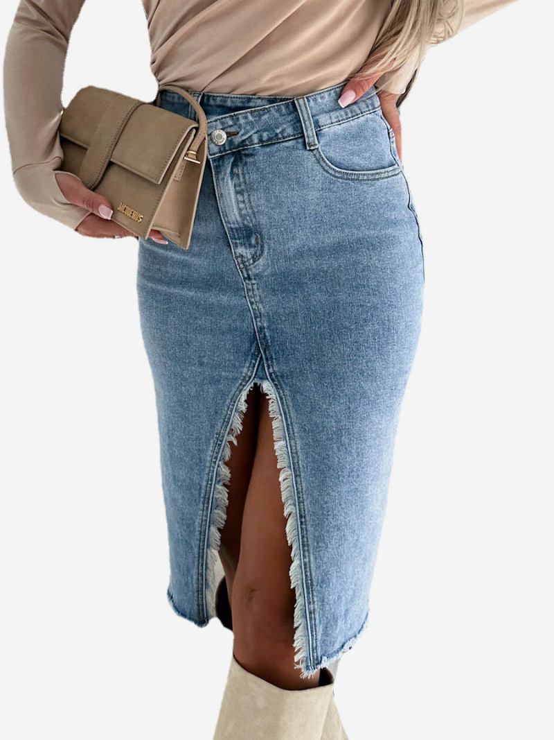 Saia Jeans Retrô Cintura Alta Com Fenda Assimétrica Parte Inferior Feminina