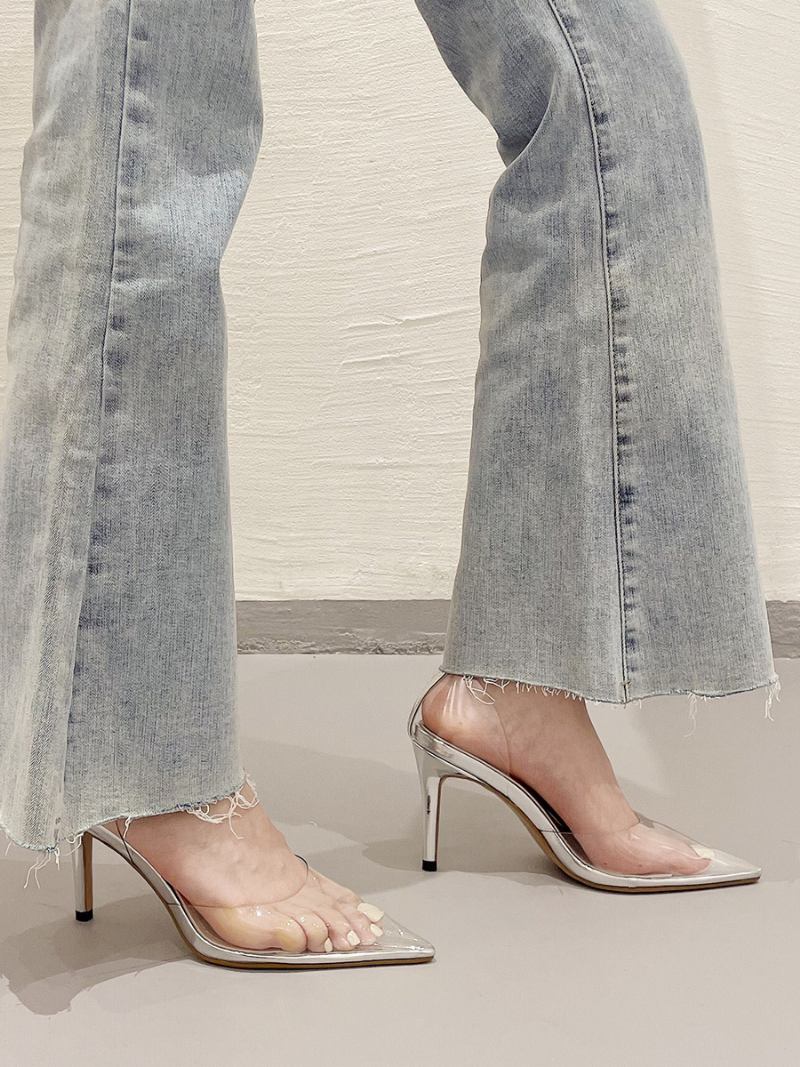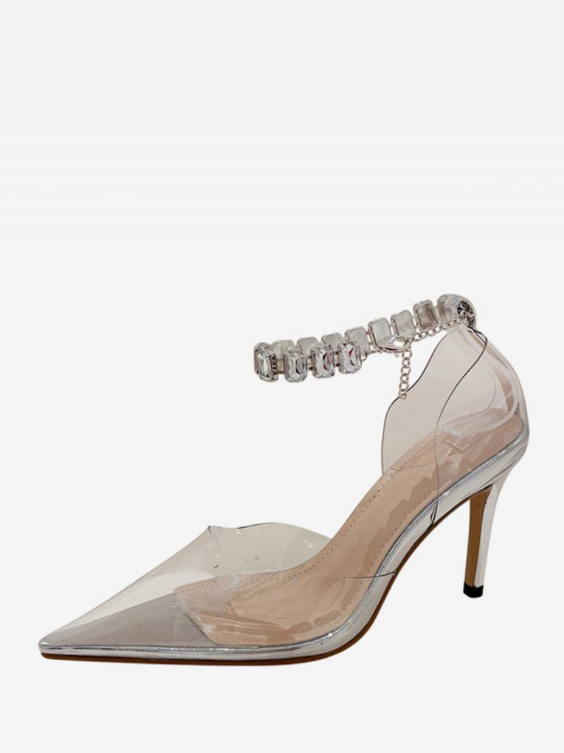 Salto Alto Feminino Rosa Transparente Bico Fino Strass Bombas Com Tira No Tornozelo