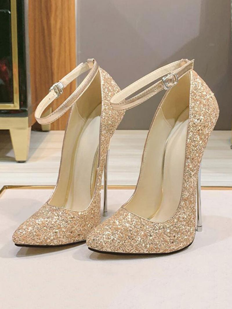 Salto Alto Feminino Vermelho Bico Fino Agulha Pano Lantejoulas Sexy Com Tira No Tornozelo