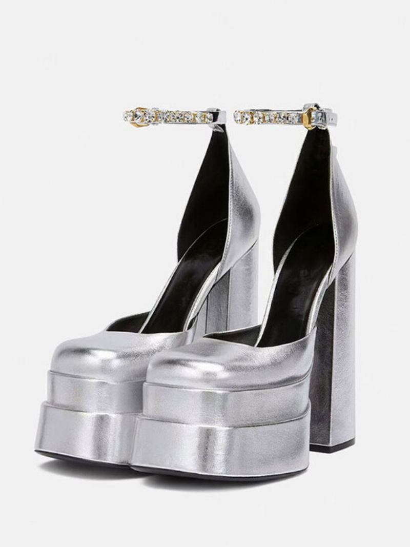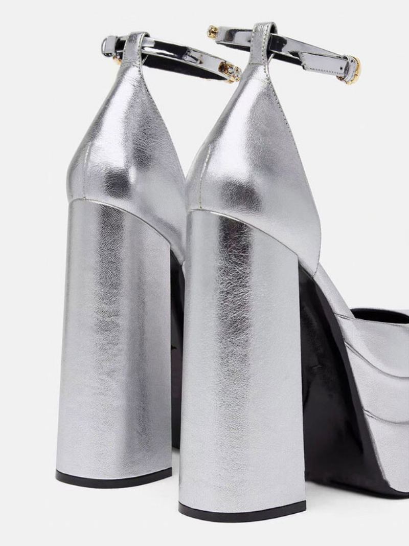 Salto Plataforma Prateado Metálico Feminino Bico Quadrado Grosso Tira No Tornozelo Sapatos Festa