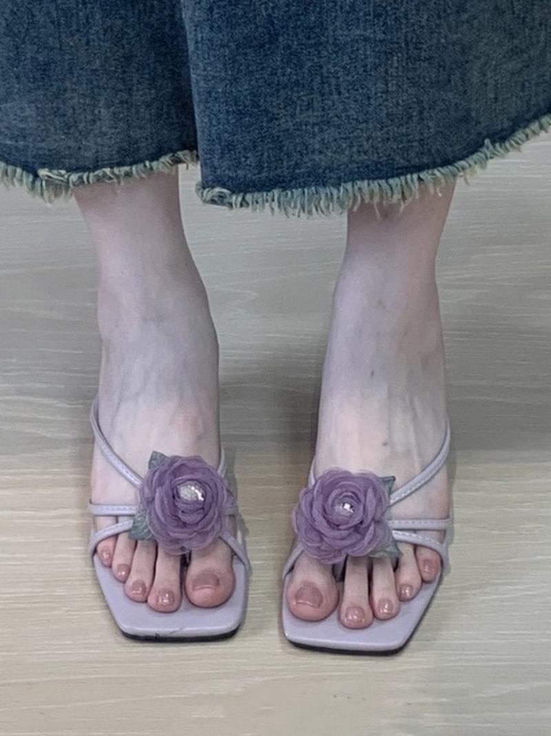 Sandálias Deslizantes Femininas Chiques Flores Couro Pu Dedo Aberto Chinelos Salto Gatinho