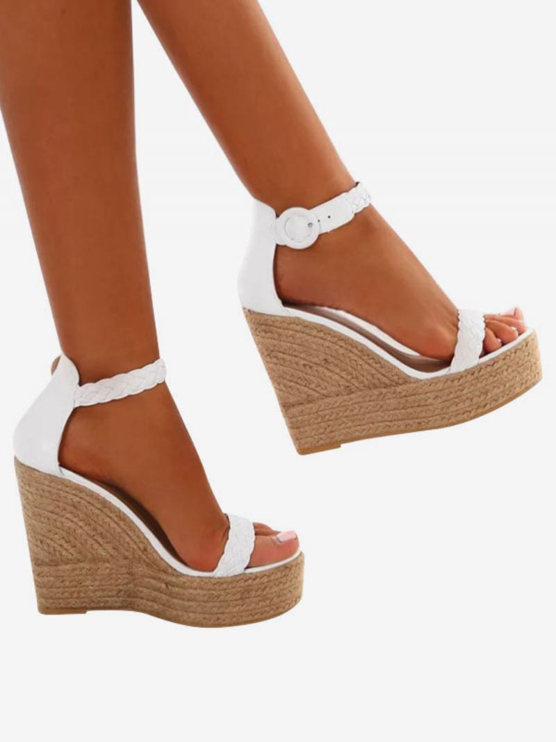 Sandálias Femininas Cunha Branca Plataforma Aberta Dedo Do Pé Fivela Detalhe Alpercatas