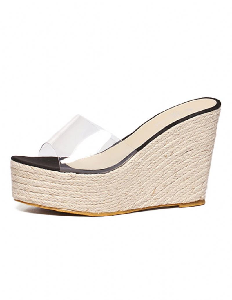 Sandálias Femininas Cunha Damasco Transparentes Peep Toe Mule Alpercatas