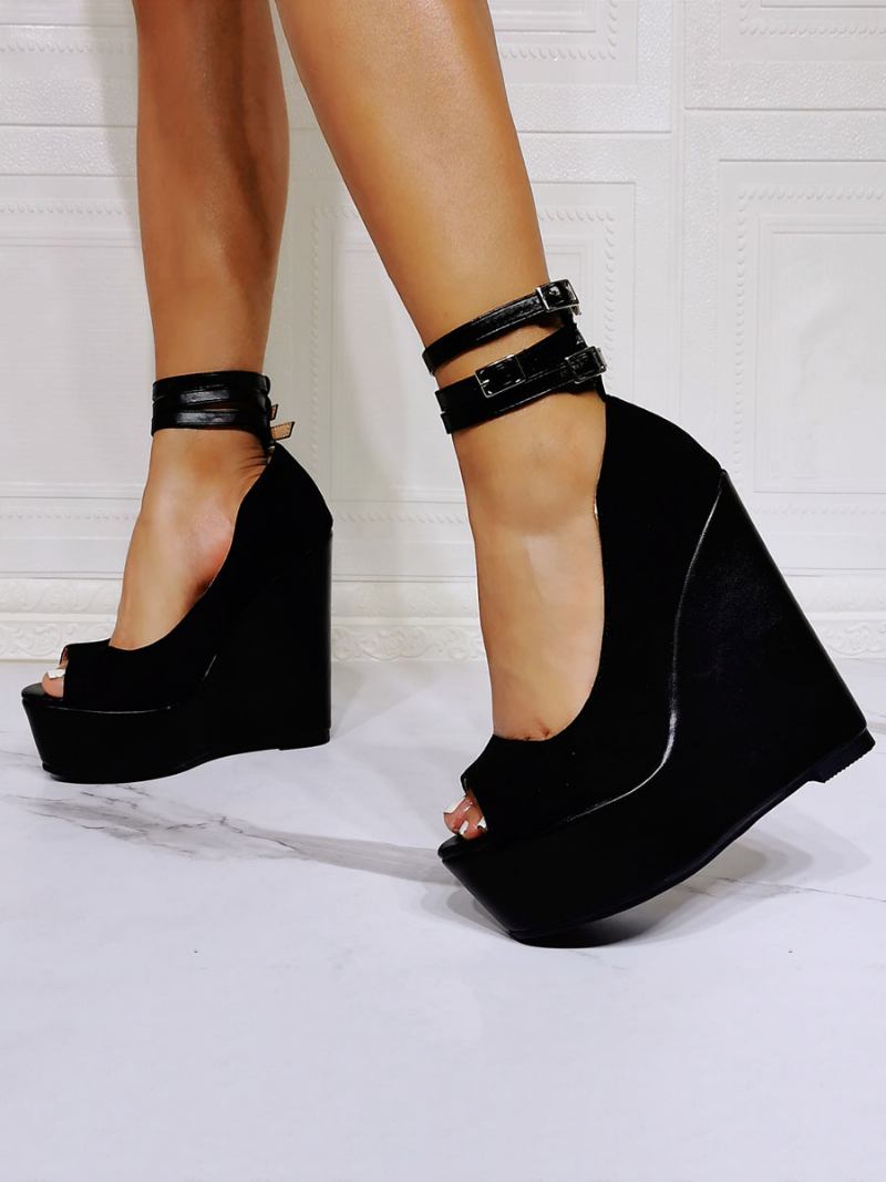 Sandálias Femininas Pretas Cunha Peep Toe Salto Micro Camurça Com Tira No Tornozelo