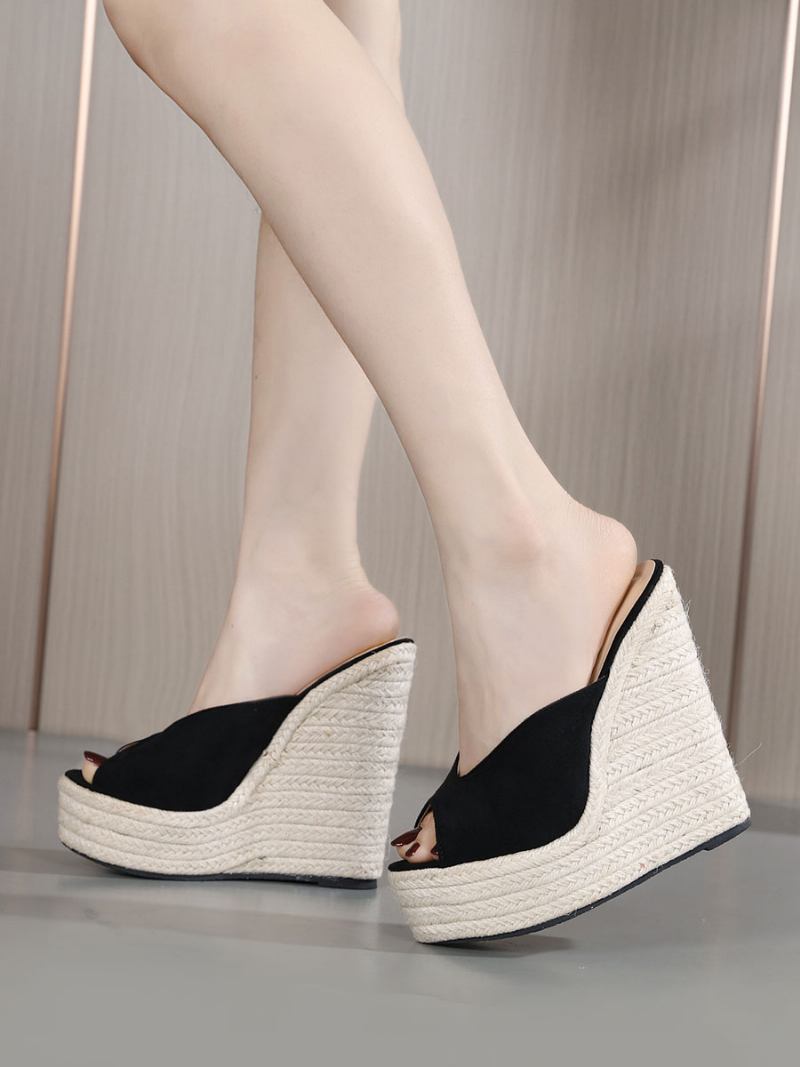 Sandálias Femininas Salto Cunha Ao Ar Livre Micro Camurça Superior Peep Toe