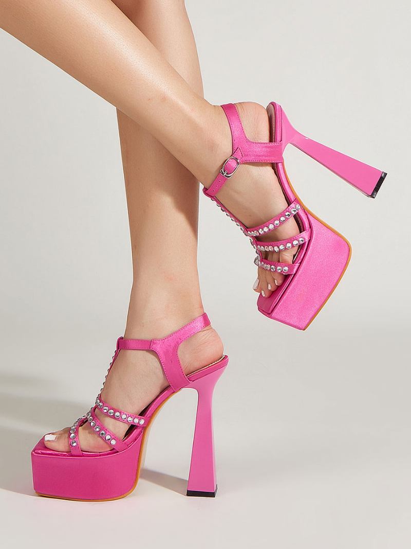 Sandálias Femininas Sexy Salto Alto Plataforma Preta Couro Pu Dedo Quadrado Strass