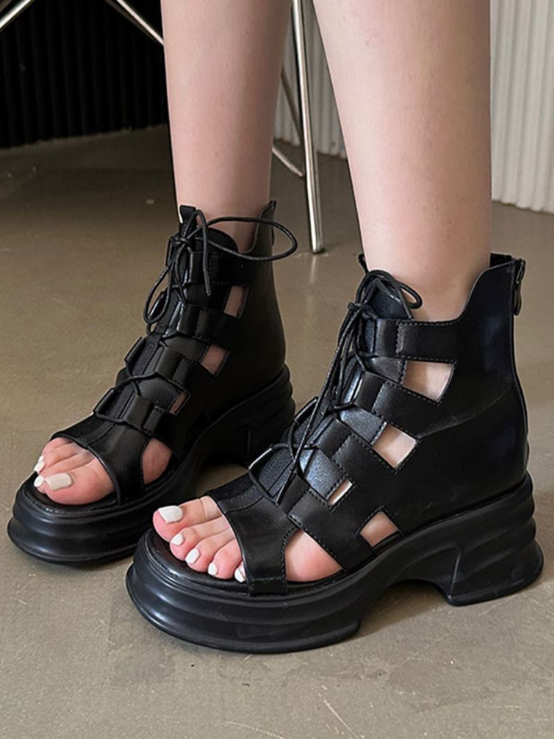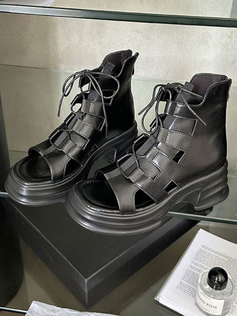 Sandálias Gladiadoras Femininas Salto Grosso Em Couro Pu Botas Verão