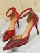 Sandálias Salto Feminino Tira Agulha Bico Fino Lantejoulas Pano Com No Tornozelo