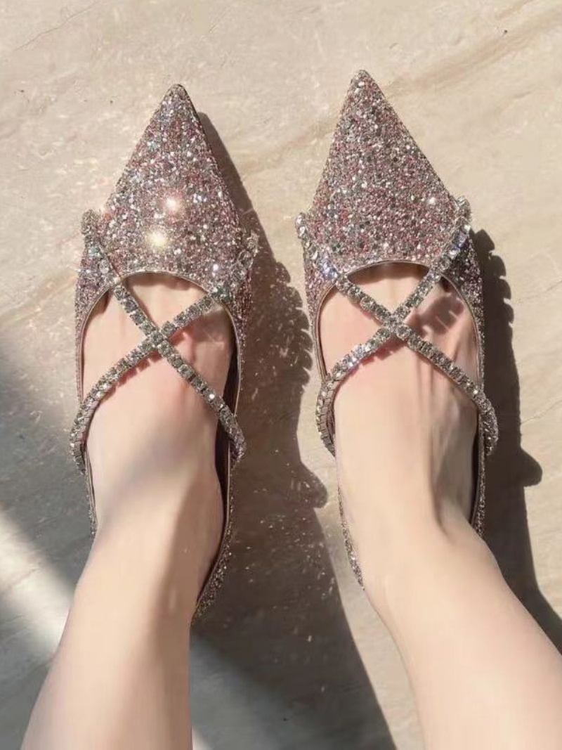 Sapatilhas Balé Femininas Lantejoulas Bico Fino Com Tiras Sapatos Casamento Planos