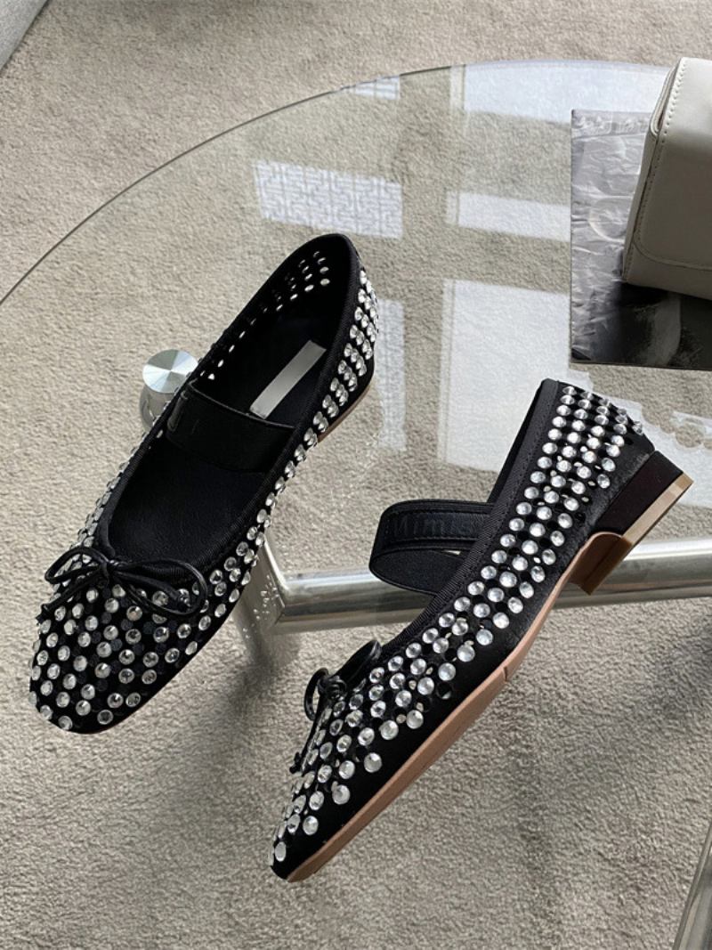 Sapatilhas Femininas Com Strass E Bico Redondo Laço Mary Jane
