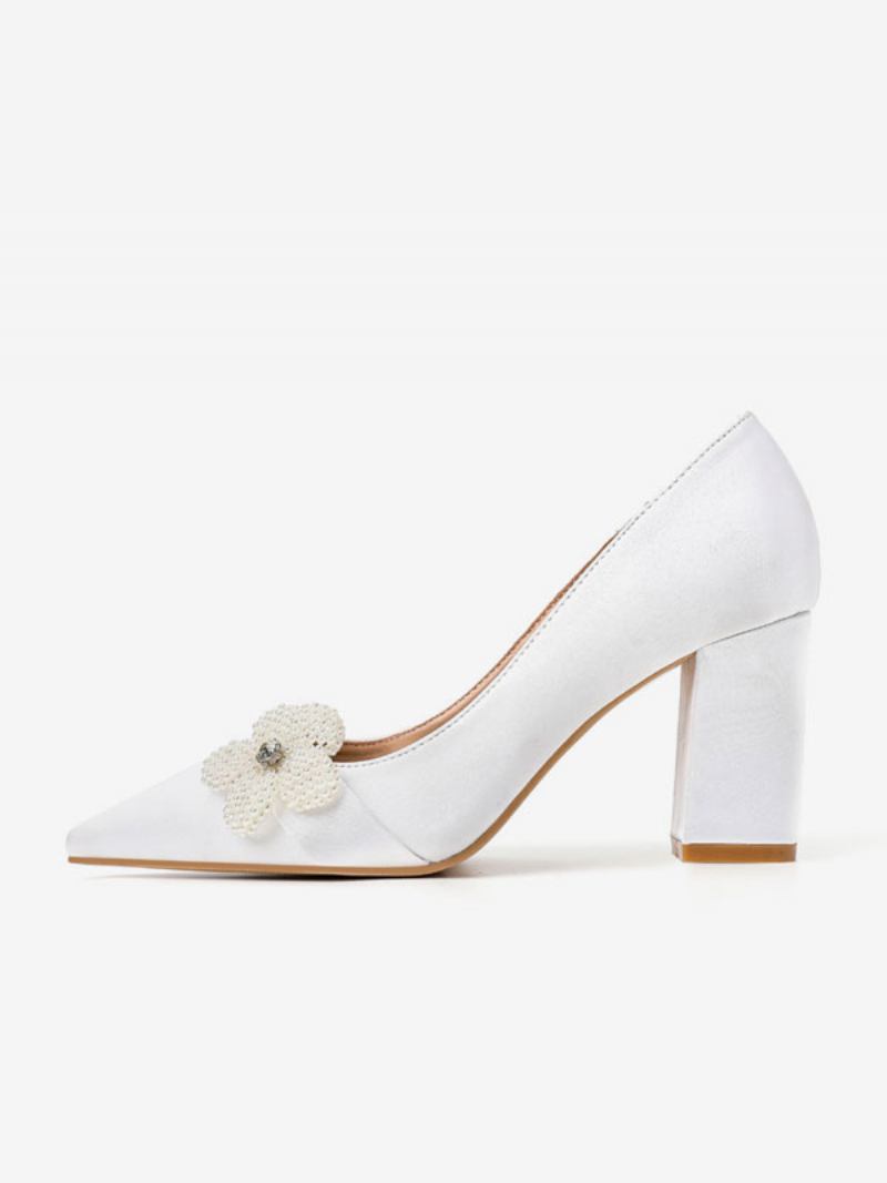 Sapatos Casamento Femininos Cetim Branco Bico Fino Pérolas Salto Grosso Noiva