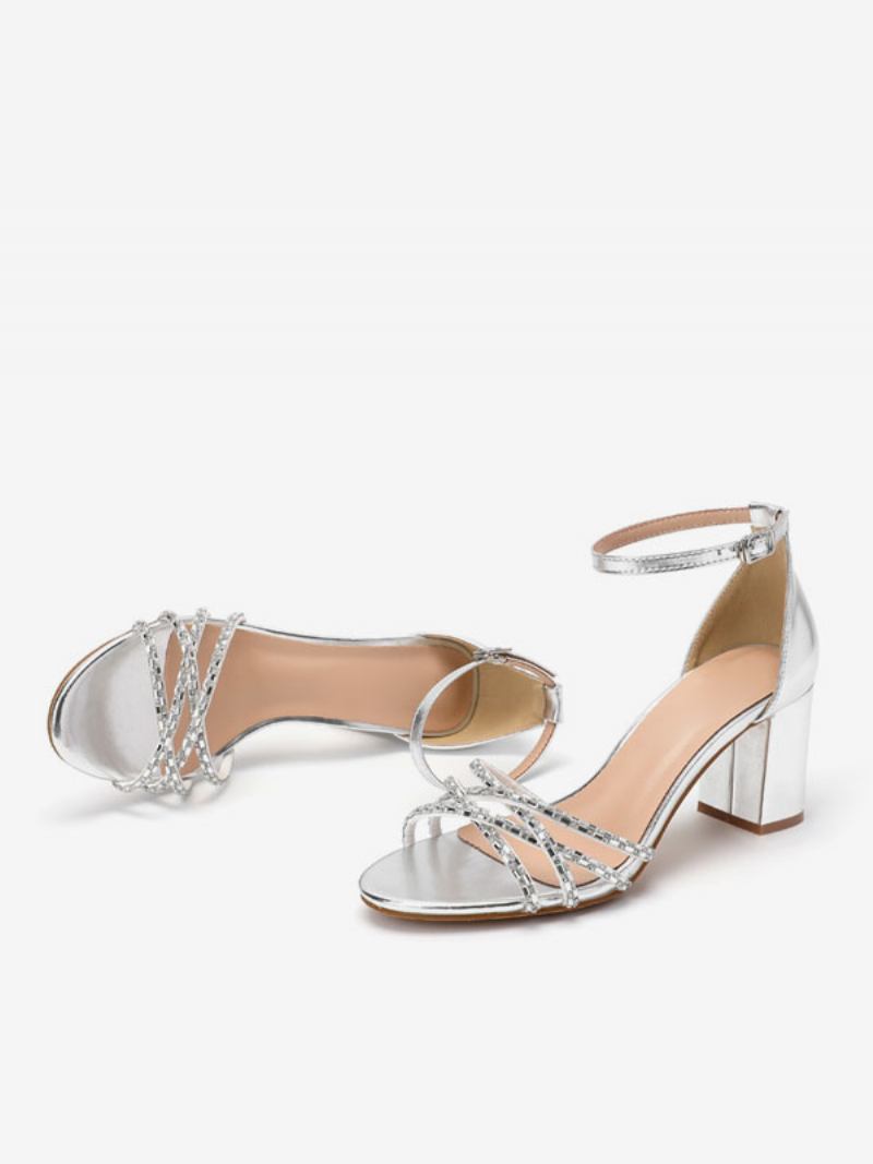 Sapatos Casamento Prateados Femininos Salto Bloco Aberto Dedo Do Pé Tornozelo Cinta Noiva