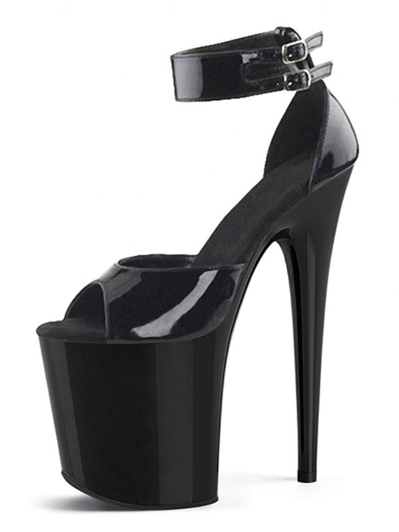 Sapatos Dança Pólo Feminino Sandálias Sexy Preto Couro Do Plutônio Dedo Pé Aberto Salto Stiletto Céu Alto Tornozelo Cinta Saltos Stripper