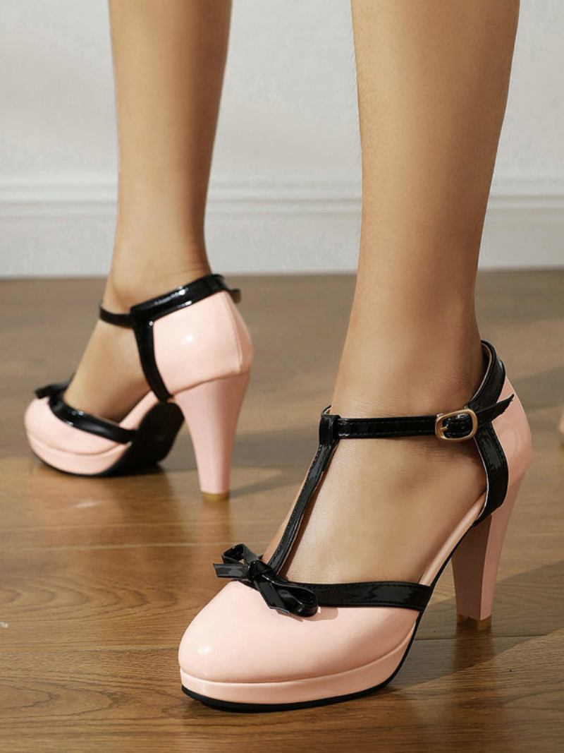 Sapatos Femininos Salto Grosso Redondo Dos Anos 50 Com Laço