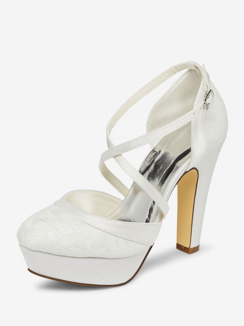 Sapatos Noiva Femininos Com Plataforma Renda E Salto Grosso Cruzados Vintage Para Casamento