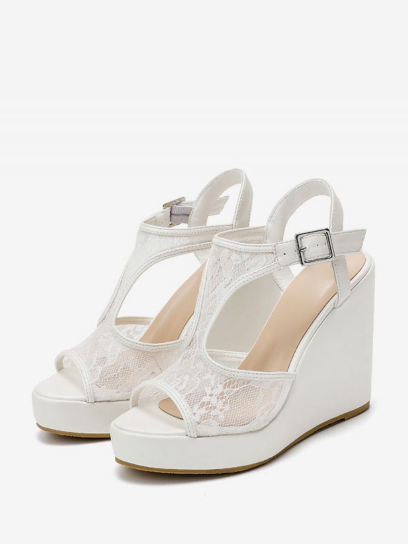 Sapatos Noiva Femininos Com Renda Branca Bico Aberto Salto Cunha