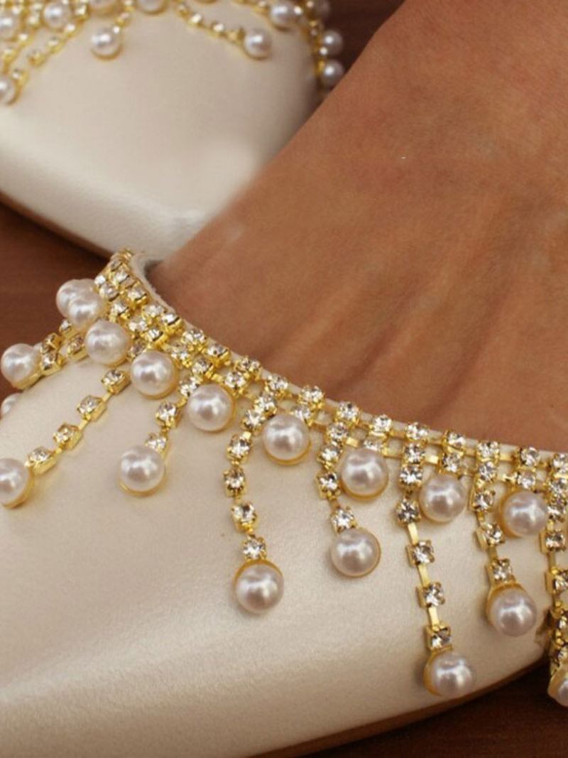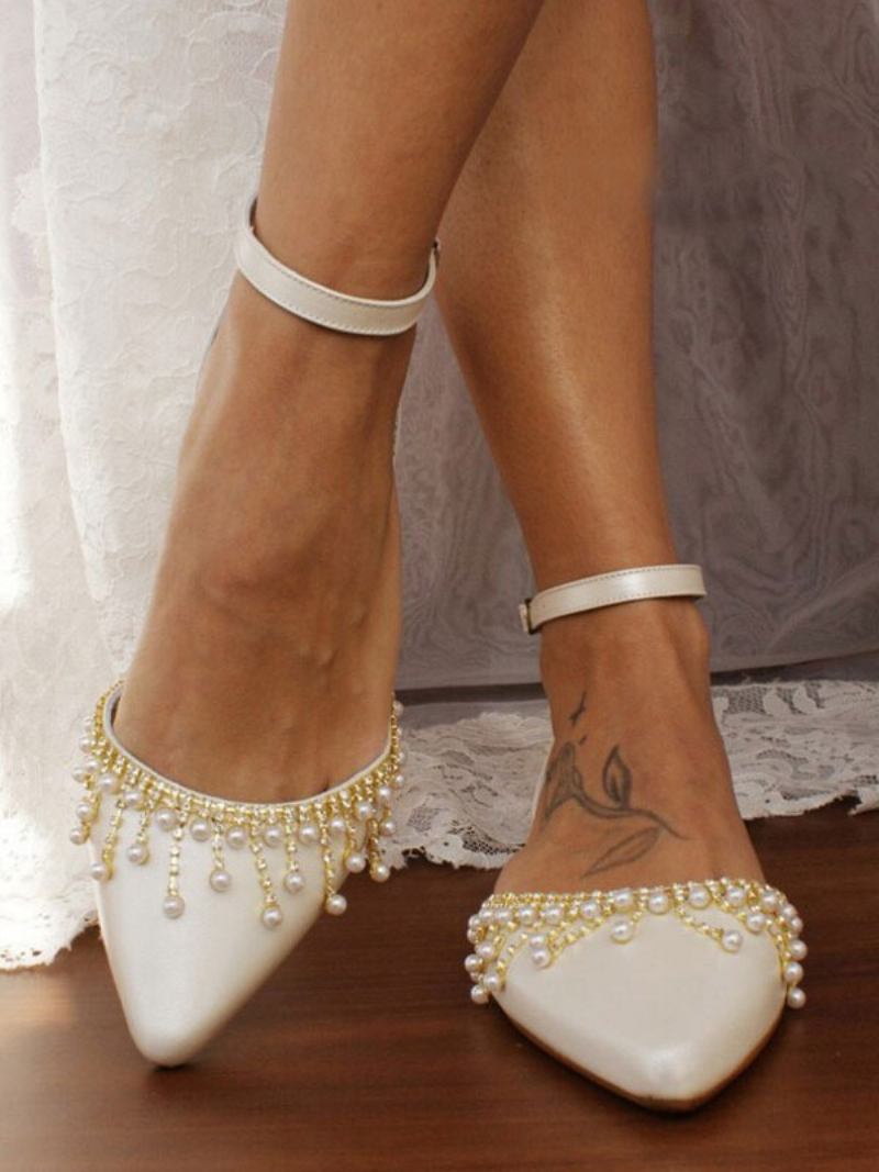 Sapatos Noiva Rasos Femininos Marfim Pontiagudo Com Detalhes Pérolas Casamento
