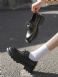 Sapatos Oxfords Femininos Pretos Com Bico Redondo E Salto Cachorrinho Cordões