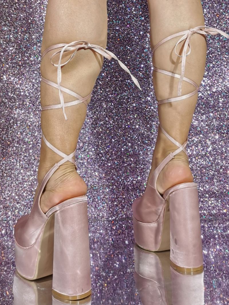 Slingbacks Femininos Com Plataforma Cetim E Salto Alto Cadarço