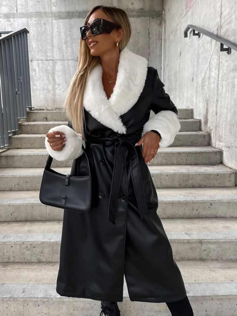 Sobretudo Feminino Couro Pu Trespassado Com Acabamento Em Pele Sintética E Cinto