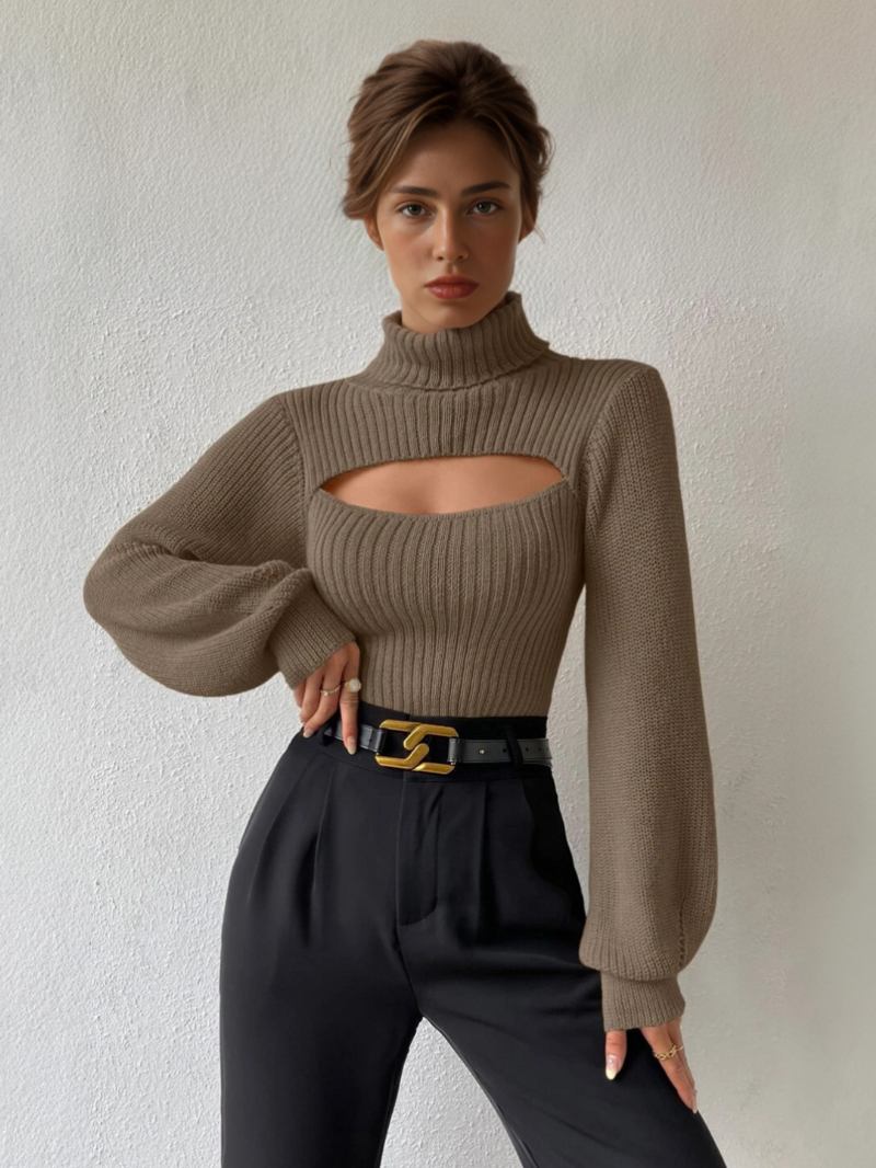 Suéter Com Nervuras Gola Alta Recorte Manguito Pulôver Sexy Para Mulheres