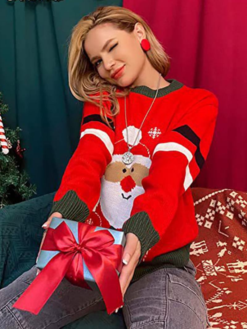 Suéter Feminino Com Gola Redonda E Padrão Natal Em Vermelho
