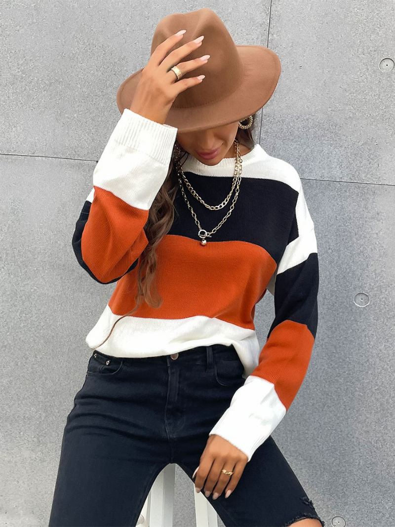 Suéter Pulôver Feminino Branco Cor Bloco Joia Gola Mangas Compridas Suéteres Elásticos
